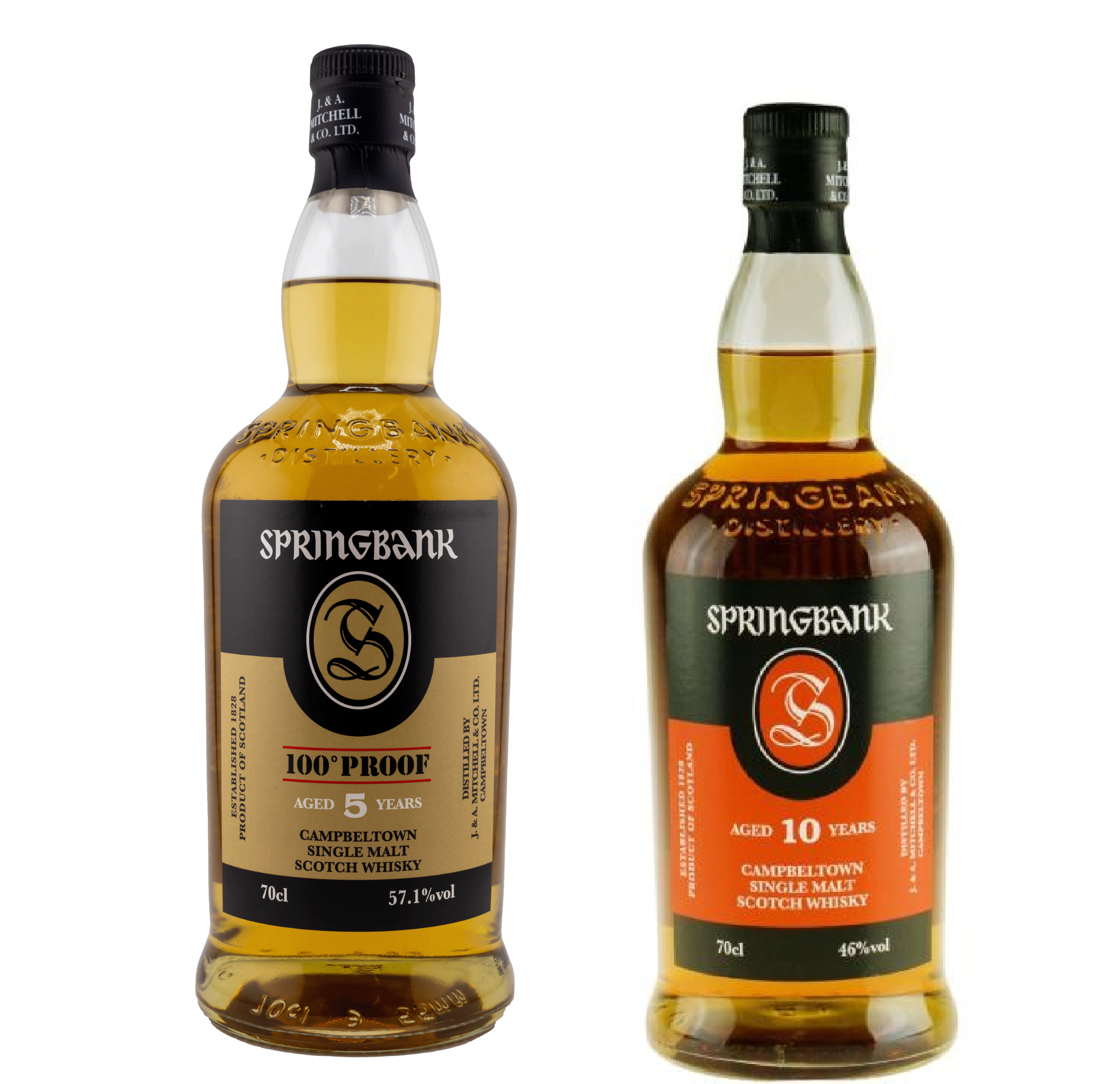 Pakken indeholder en flaske Springbank 5y old 100 Proof 57,1% samt en flaske Springbank 10y 46%