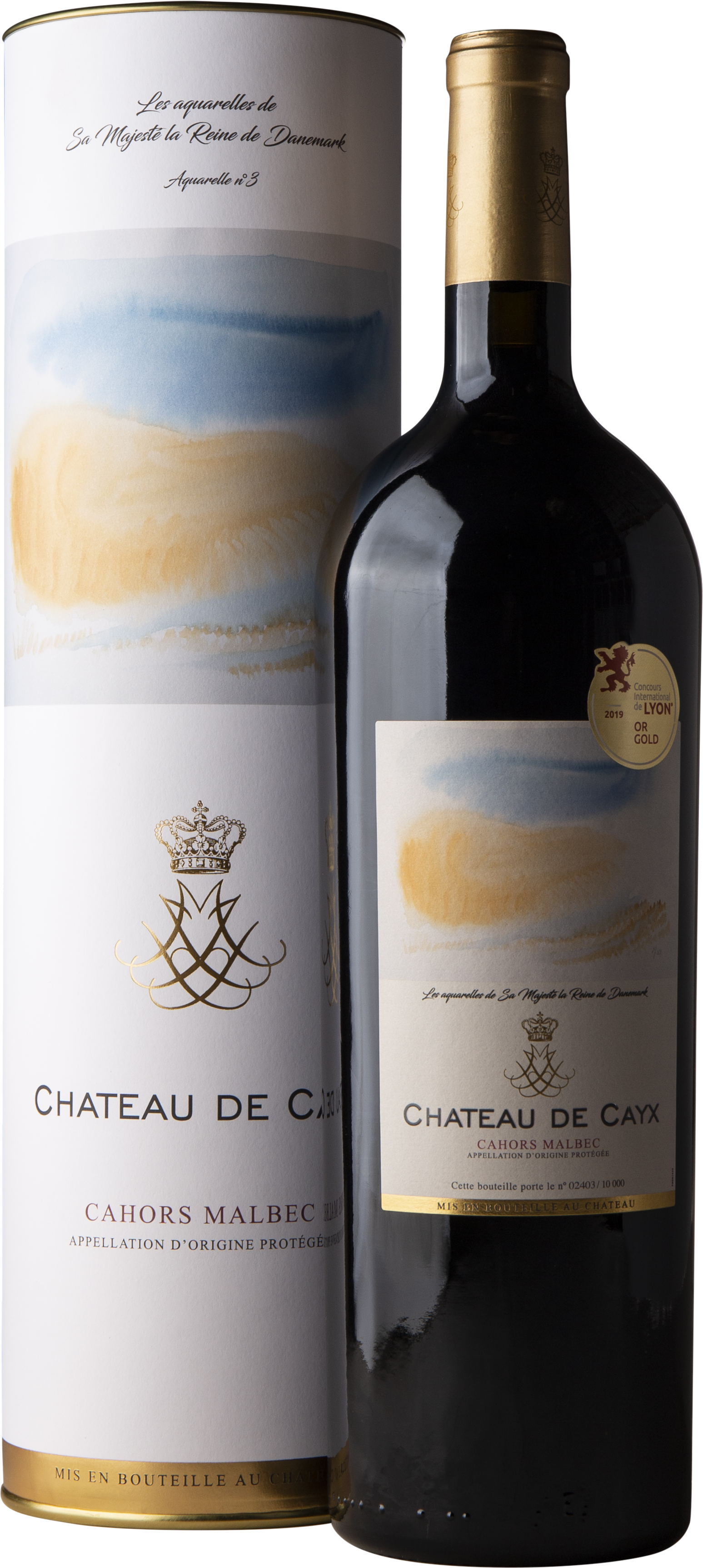 Etiketten til Les aquarelles de Sa Majeste la Reine de Danemark er illustreret af Dronning Margrethe og viser Chateau de Cayxs vinmarker. Vinen findes kun i magnumflasker og er et unikt samlerobjekt.