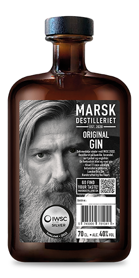 MARSK GIN ORIGINAL 40%. SØLVMEDALJE VINDER VED IWSC 2022. Marsk Gin Original destilleret på kamille & lavendel & sort peber & englehår mm. Ginnen har en fantastisk rund smag og der er ialt 11 botaniske krydderier tilsat. Håndlavet på vores nye kobberdestilleri helt fra bunden - London Dry Gin. Serveres med tonic - gerne en tør og top med masser af is & citron eller rosmarin.